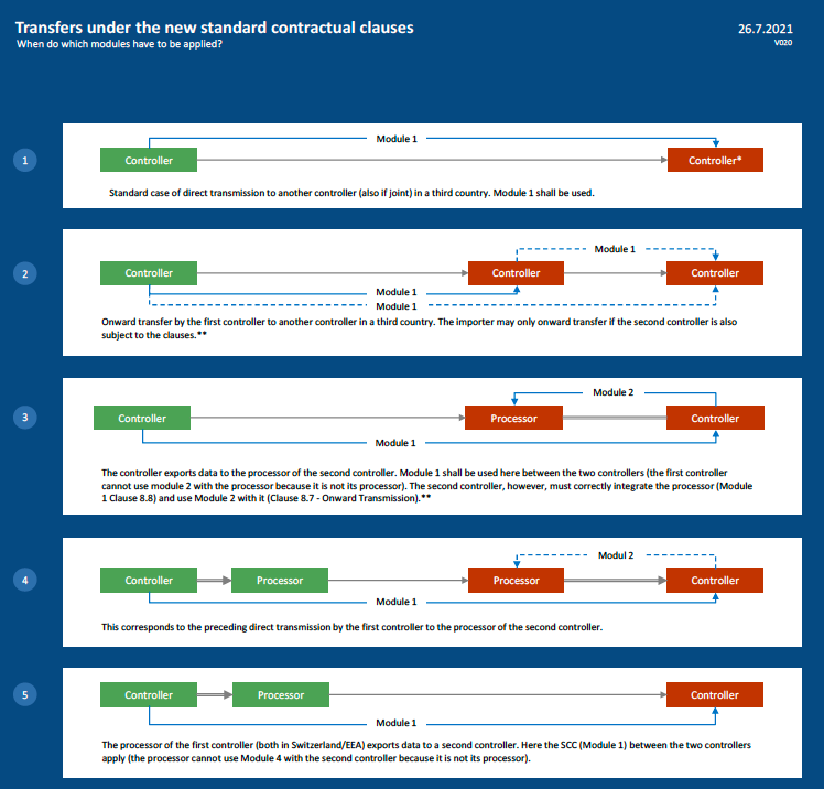 You might not find it straightforward to understand the new structure of the SCCs with four modules and various voluntary clauses. Then this overview from Walder Wyss attorneys, can be helpful: Overview SCCs constellations. Here is a preview of the 5 first scenarios: